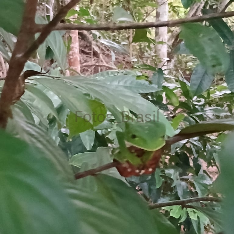 Imagina essa cena: uma pequena árvore, ali na beiradinha da floresta, quase tímida no meio da imensidão verde. Mas calma — ela guarda um segredo sensacional. Em meio aos galhos finos, perfeitamente camuflada, está uma perereca verde, dona do pedaço. Com aquele olhar curioso e corpo delicado, ela parece a guardiã da árvore, como se estivesse dizendo: “Essa aqui é minha, viu?”